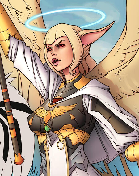 The Moreaux family, despite originating in Sharlayan, has had a foot in the Holy See of Ishgard for generations now. Thus, when her father Jerard discarded neutrality in order to pursue a vendetta against Garlemald and rescue the forcibly-conscripted Jocelyne, Joyette relocated to her relative's estate in the Holy See, given to the family in recompense for their ancestor Adalhard's valor as a Convictor Knight. It was only shortly after her relocation that Joyette entered the priesthood.Like most every Moreaux, Joyette's aether is heavily aspected, comparatively at least, towards Water, and further polarized quite heavily towards Light. Being born to an Elezen father and a Keeper Miqo'te mother, Joyette is half-Elezen, and half-Miqo'te. As the Moreaux family is inextricably tied to the sea, Joyette has no small amount of experience on the waves, and the manipulation of Water-aspected Aether comes naturally to her. When expending great amounts of her Aether and allowing it to manifest outwardly, Joyette is able to form six wings upon her back, which are accompanied involuntarily by a halo above her head. She prefers seafood, and is an avid collector of seashells and nautical memorabilia, though such things are commonplace among Moreaux's.Though she is slight and demure, Joyette readily dons armor and is more than willing, some might say eager, to supplement her magic with devastating blows from her mace, relying upon the supernatural empowerment of her Aether and the immutable stubbornness of fanaticism, wrath and fury.