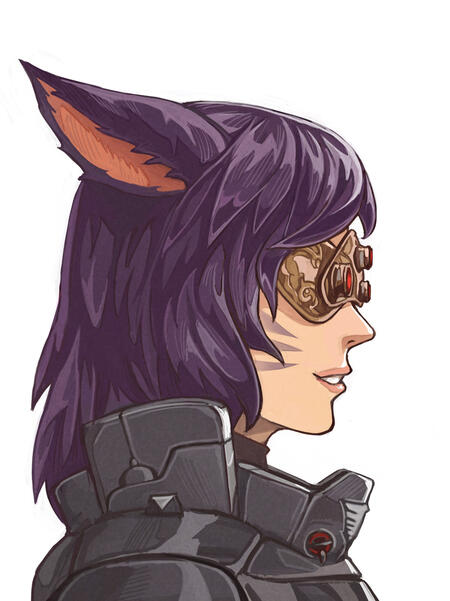 Eccentric, troubled, and singularly excessive, Jocelyne Moreaux has come a long way from the many difficulties she faced in her youth. Admitted into the Studium alongside her twin sister Joyette, Jocelyne's educational needs went unmet by the strict, orthodox, particular instructors of Sharlayan, who were unimpressed with her only real achievement; her devised method for generating and controlling sound by means of Lightning and Wind Aether. Failing out of the Studium, Jocelyne swiftly fell into bad crowds and soon departed the Sharlayan motherland, living a volatile and vulnerable lifestyle of substance abuse and constant travel. Jocelyne would, alas, seemingly never make it back to her family or her home however, as she found herself on the wrong side of a conflict between the Eorzeans and Garlemald, and she was captured and sentenced to conscription. This was, at least, a blessing in disguise of sorts, for Jocelyne discovered her own aptitude for technology and, soon after, mathematics.Jocelyne was quickly sent to the prestigious Academy in Garlemald, and with the Academy's intensely targeted education programs Jocelyne found herself well and truly learning for the first time in her life, excelling even. Fear, longing and the agony of addiction soon gave way to her insatiable passion for technology and music, and the Elezen/Miqo'te half-breed was soon recommended to the VIIIth Imperial Legion. Sadly, her burgeoning love for the Empire was cut short as she learned the truth of the Weapon projects, and upon discovering this she made plans to defect... Plans that would culminate in a return to Jocelyne's family.Jocelyne is, ultimately, a being of many contradictions. She is affable and jovial, yet blunt and unwittingly rude. Dimwitted and lacking in sense, yet mathematically logical and unerringly sharp in engineering. Though she can talk very much, she struggles with truly communicating, and most social queues go over her head. While her outward silliness can be deceiving, she is ultimately quite selfish, almost extremely so, and will prioritize herself over just about anyone without a very good understanding of why this is wrong. Aside from her passion for music and technology, she is also an excellent ballet dancer, having been a ballerina since she was just a girl. Jocelyne can, and will, eat just about anything, and her tiny frame can shovel in seemingly impossible amounts of food in the blink of an eye!At some point after her conscription, Jocelyne became involved with a secret society-esque Techno-centric cult of Byregot worshipers, and since then has become deeply religious as faith blended together with her voracious appetite for technology. Jocelyne praying over her heavily-customized, self-made suit of Power Armor or chanting canticles as she carries out otherwise mundane maintenance on various machines are by no means uncommon sights.Curiously, Jocelyne is never seen without goggles, visors, or wholly-opaque glasses, leaving the appearance of her eyes a complete mystery.